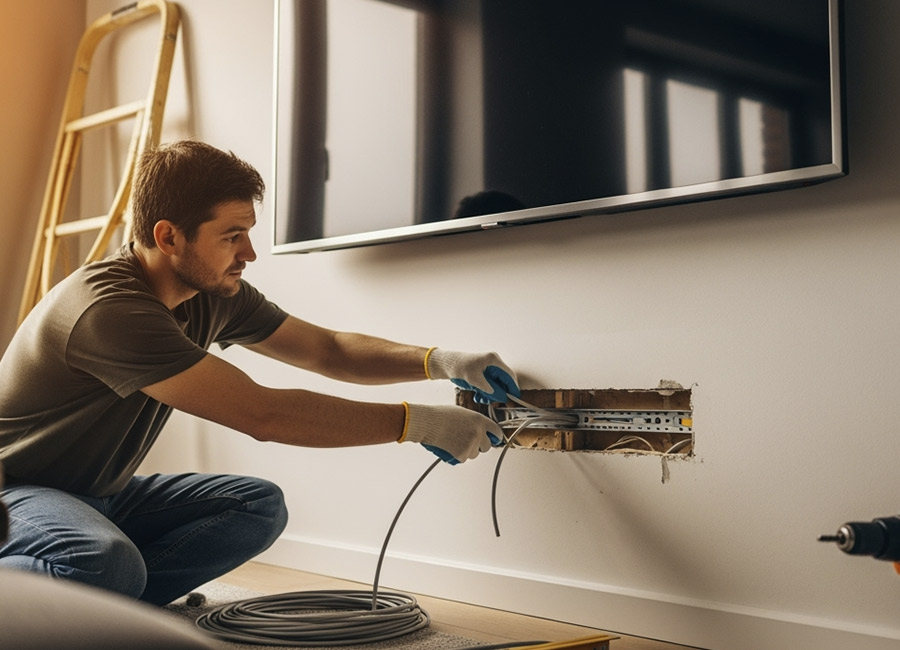 - Pasa los cables de la tv por dentro de la pared con ayuda de una placa o guía. Fíjalos bien y, una vez estén los cables colocados en su posición correcta, vuelve tapar con masilla los agujeros de la pared.
