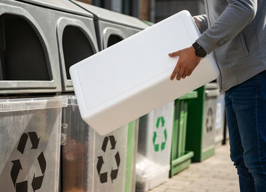En el caso de algunas tiendas dedicadas a la venta de vinos y comestibles en cajas de poliespan, es común encontrar contenedores específicos para su recolecta. Esto es así porque, antes de llevarlos a planta para empezar su proceso de reciclado, el poliespan debe limpiarse de posibles restos de alimentos y otros contaminantes.