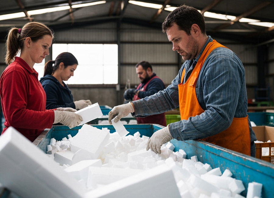 Una vez recolectado, el corcho blanco se somete a un proceso de separación y clasificación. Durante este paso, se eliminan contaminantes como etiquetas, cintas adhesivas y restos de alimentos. Luego, se clasifica según su tipo y densidad, ya que hay varios tipos de porexpan.