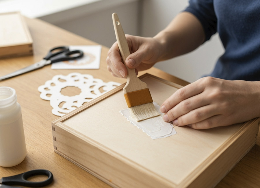 Aplica una capa fina y uniforme de cola para decoupage en la superficie del objeto y en la parte posterior del recorte que vas a utilizar.