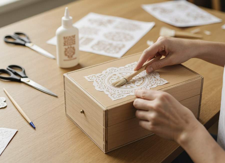 Coloca cuidadosamente el recorte sobre la superficie del objeto y asegúrate de que no queden arrugas ni burbujas de aire. Puedes utilizar un pincel suave o tus dedos para alisar el diseño, si te es más sencillo.
