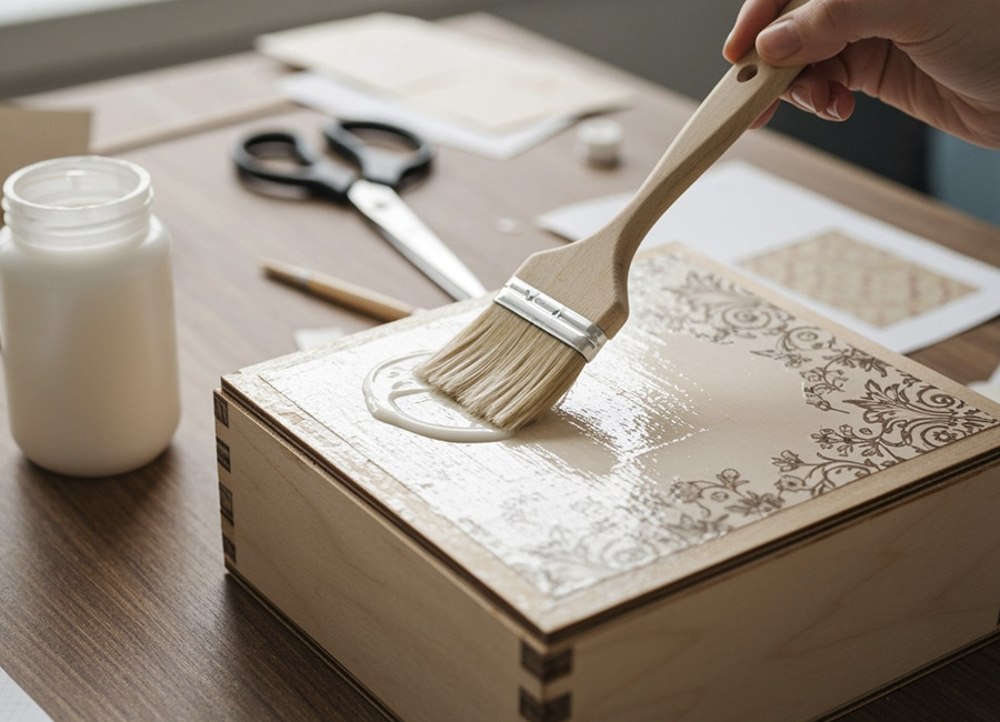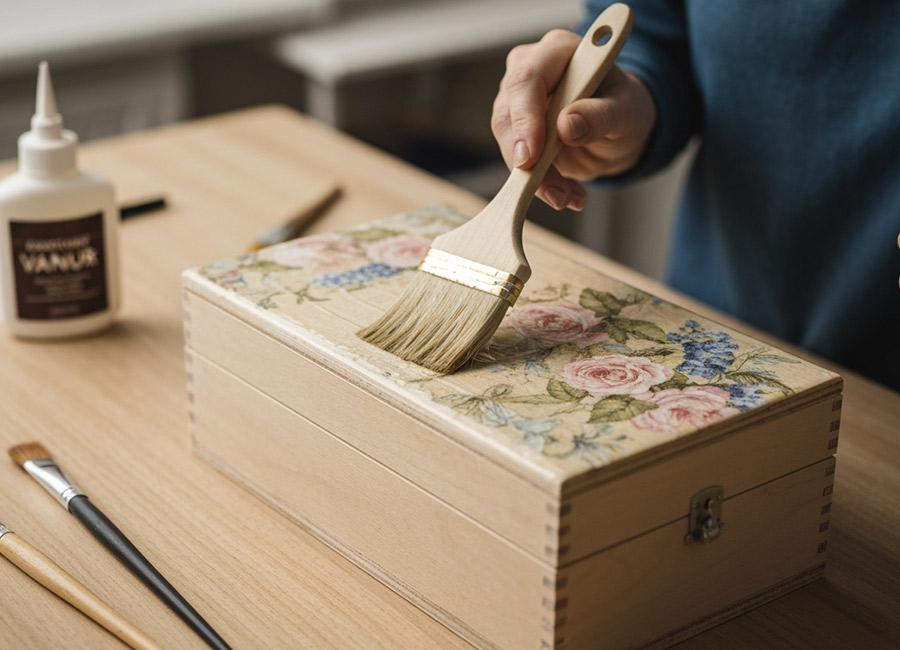 Una vez que el diseño esté en su lugar, aplica otra capa de cola para decoupage sobre toda la superficie del objeto para sellar el diseño y protegerlo.