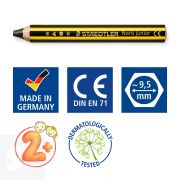 ¡El primer lápiz de grafito ideal para niños en tamaño extra grueso! Se adapta perfectamente a las manos de los más pequeños y la mina super gruesa aporta una resistencia extra a la rotura durante el uso y el afilado. Cuerpo en forma hexagonal y diseño a rayas Noris amarillo/negro. Graduación 2B. Dermatológicamente testado. Lápiz ecológico, con madera con certificación PEFC, procedente de bosques de gestión sostenible. Blíster con un lápiz 141-2B.