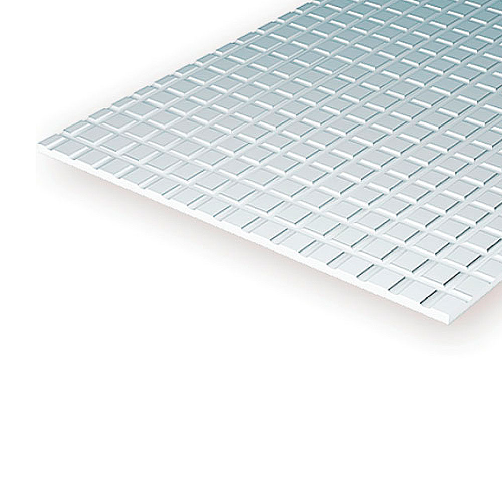 Evergreen Hoja grabada en cuadrícula "Sidewalk" de Estireno Blanco. Medidas: 15 x 30cm, 1 mm de grosor y espaciado de 6,3 x 6,3 mm. Envase de 1 unidad.