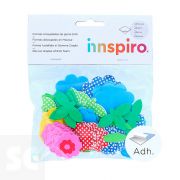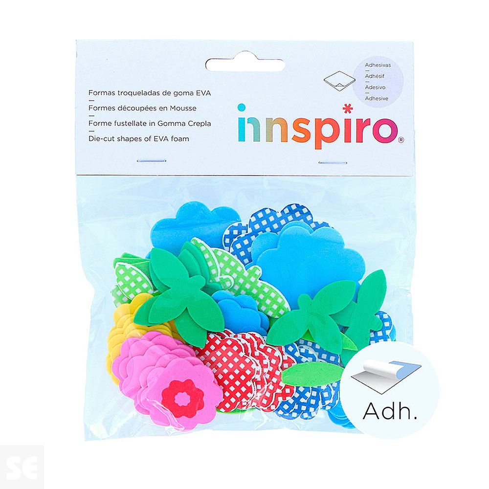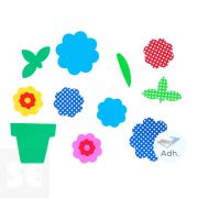 Flores y macetas de goma Eva adhesiva en seis colores distintos. Ideales para potenciar la creatividad de los más pequeños complementando trabajos de manualidades. 2 medidas: 35mm y 52mm.