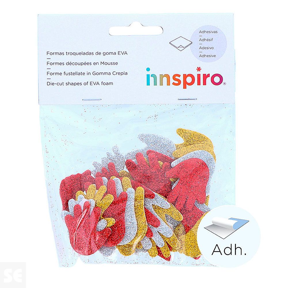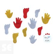 Manos y pies de goma Eva adhesiva con purpurina en 3 colores distintos. Ideales para potenciar la creatividad de los más pequeños complementando trabajos de manualidades. Incluye dos medidas: 36mm y 45mm.