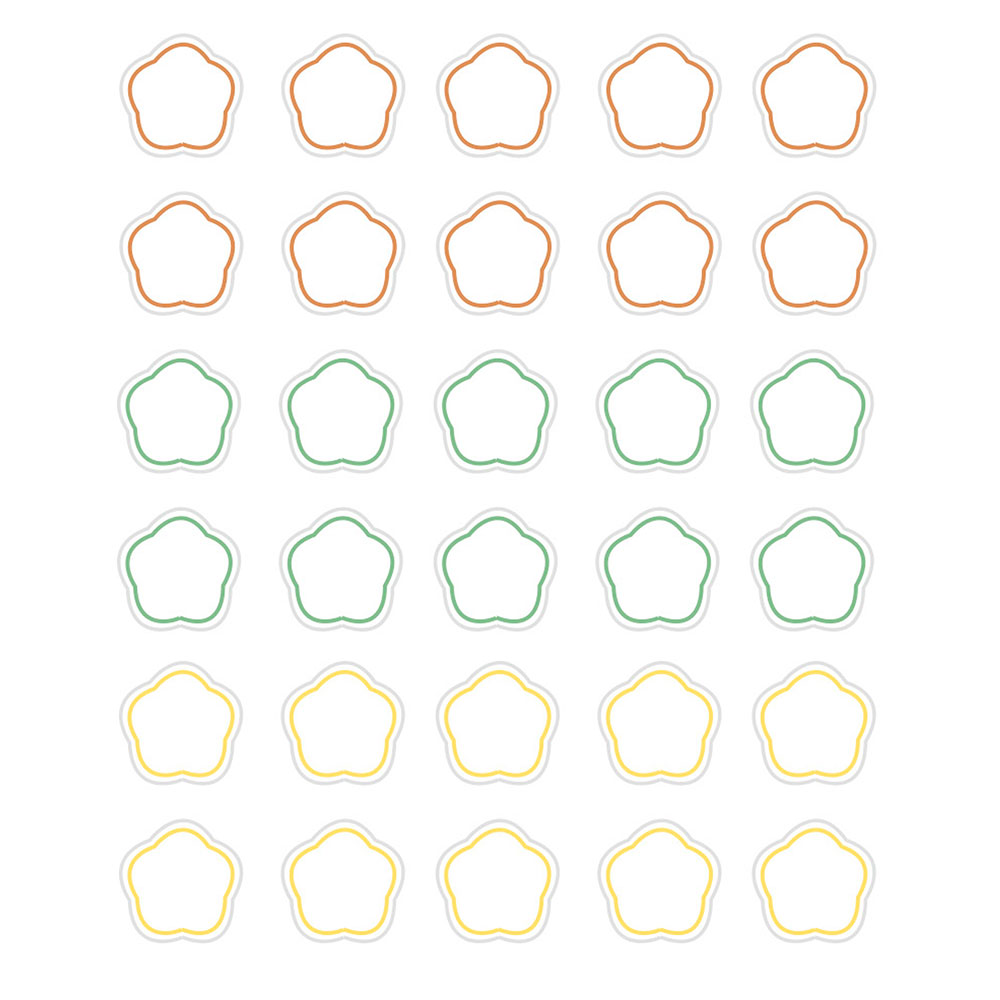 Cada hoja contiene 30 pegatinas pre cortadas de tres colores distintos (10 pegatinas de cada color). Para pegar en diferentes superficies planas como papel, madera, cartón, metal, textil, etc. Aplicación sencilla, fácil y limpia.