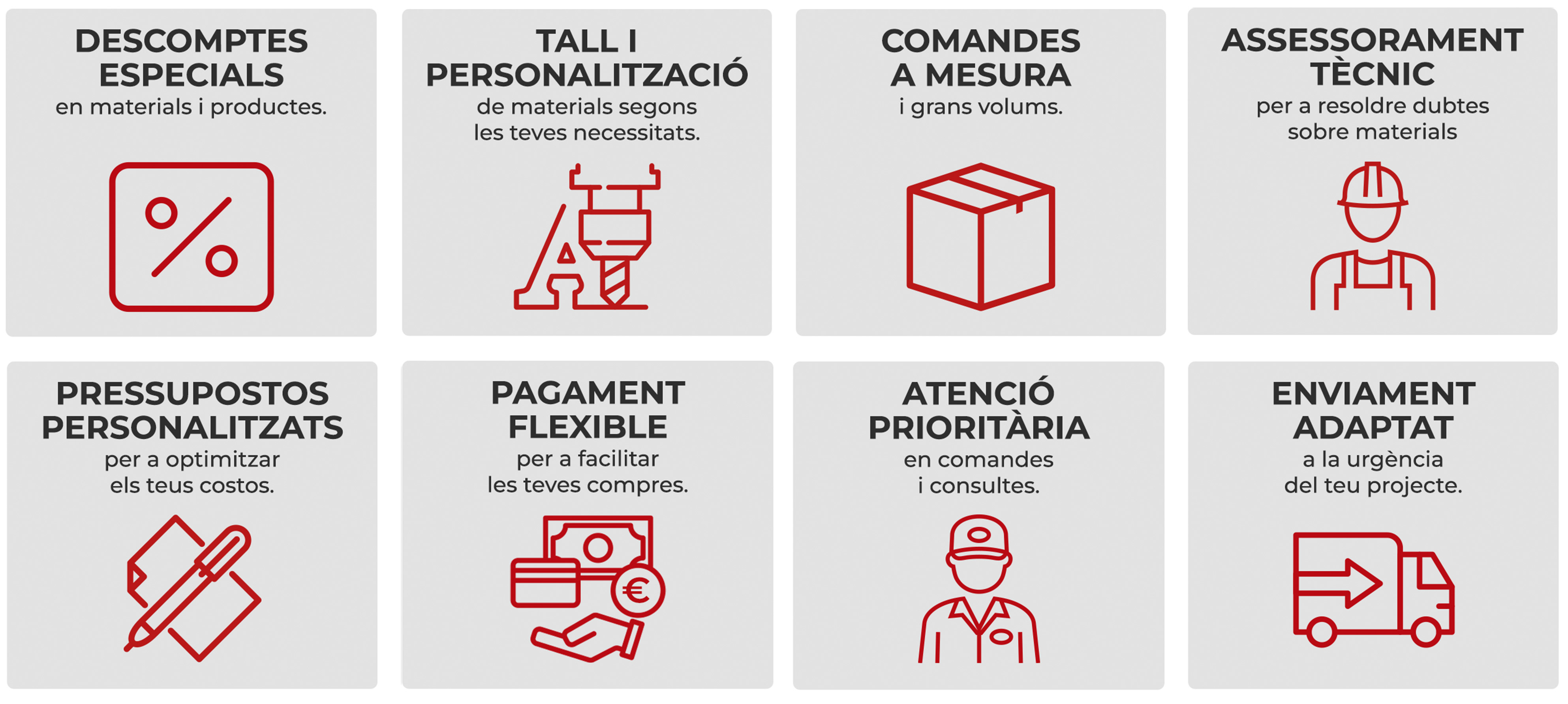 Si et dediques al sector professional, saps com és d’important comptar amb materials de qualitat, bons preus i un proveïdor de confiança que t’ajudi a optimitzar costos i temps en cada projecte. No perdis més temps i uneix-te a la nostra comunitat de professionals.
