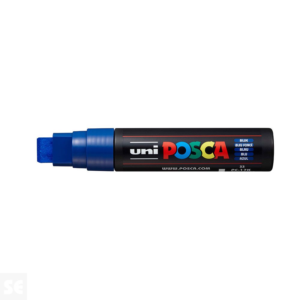 Rotulador Pintura Posca Azul Pc17k 15 mm. Cuerpo de plástico (PP). Marcador de pintura con tinta pigmentada base al agua. Pinta sobre cualquier superficie y es muy resistente a la luz. Es inodoro. Las manchas se pueden lavar con agua, desapareciendo inmediatamente. Ideal para cartelería, decoración, escaparatismo, posters, etc. Permanente sobre superficies porosas. NO ES TÓXICO.