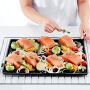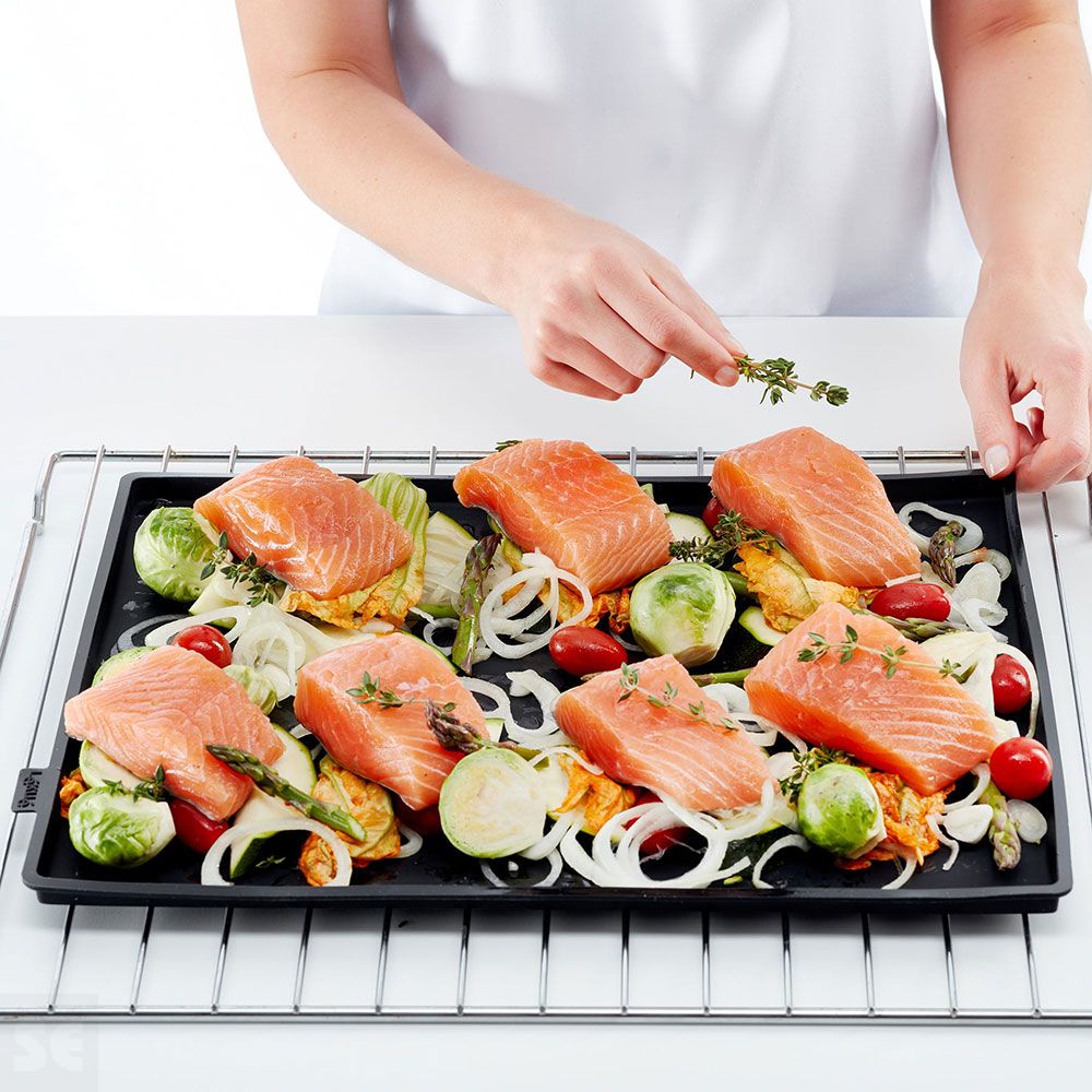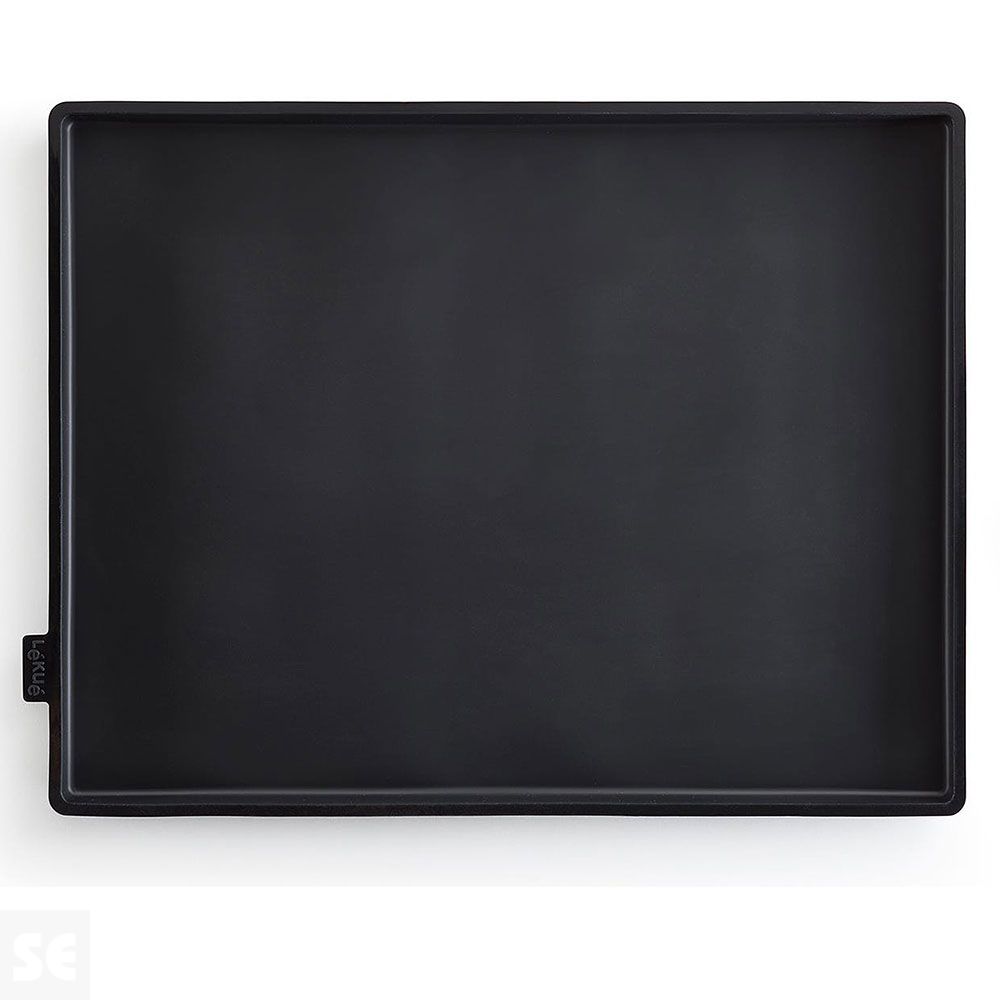 Salvabandejas antiderrame para horno: Colocado sobre la bandeja o rejilla del horno, evita que los alimentos se peguen e impide el derrame de líquidos, manteniendo el horno limpio. Ideal también como base de trabajo. Fabricado en silicona platino 100% calidad alimentaria. Color: negro. Medidas: 40x30 cm. Temperatura: -60°C / +220°C. Apto para microondas, nevera y lavavajillas.