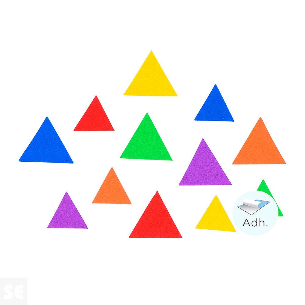 Triángulos de goma Eva adhesiva en 6 colores distintos. Ideales para potenciar la creatividad de los más pequeños complementando trabajos de manualidades. Incluye dos medidas: 32mm y 42mm.