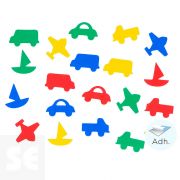 Vehículos de goma Eva adhesiva en 4 colores distintos. Ideales para potenciar la creatividad de los más pequeños complementando trabajos de manualidades. Cinco formas: Coche, camión, autobús, barco y avión.