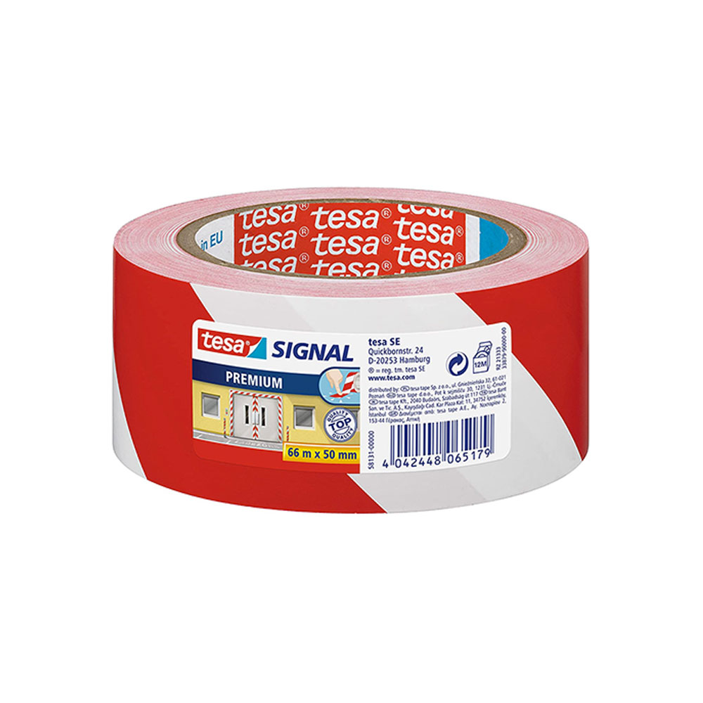 Cinta adhesiva de señalización, en colores rojo y blanco, para marcar las distancias de seguridad necesarias en el interior o exterior de cualquier recinto o establecimiento, o para indicar distintas zonas de trabajo. Fácil de aplicar y de clara visibilidad.