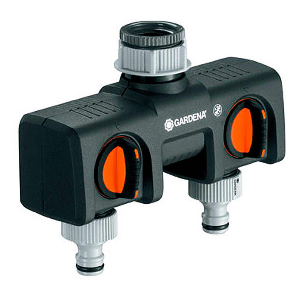 El distribuidor de dos vías GARDENA permite conectar a la vez dos accesorios a un grifo. Las salidas son totalmente regulables. Pueden conectarse dos programadores de riego GARDENA al distribuidor. El distribuidor de 2 vías GARDENA es apto para grifos con rosca de 26,5 mm (3/4") y (1").