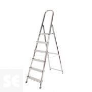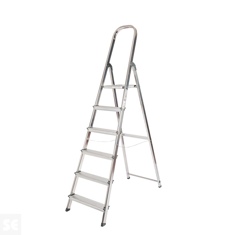 Escalera de aluminio resistente y ligera de 6 peldaños. Componentes: Arco de apoyo con altura de seguridad de 60 cm, peldaños antideslizantes y con sistema de puntos fuertes, rellano con sistema de seguridad, amplia superficie de apoyo y y cable de limitación de abertura de acero. Resistencia de carga: 150 kg, Altura máxima: 1220 mm (hasta plataforma), Altura escalera abierta: 1830 mm. Escalera Certificada por AENOR según Norma Europea EN-131.