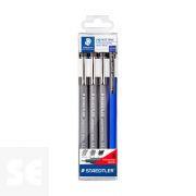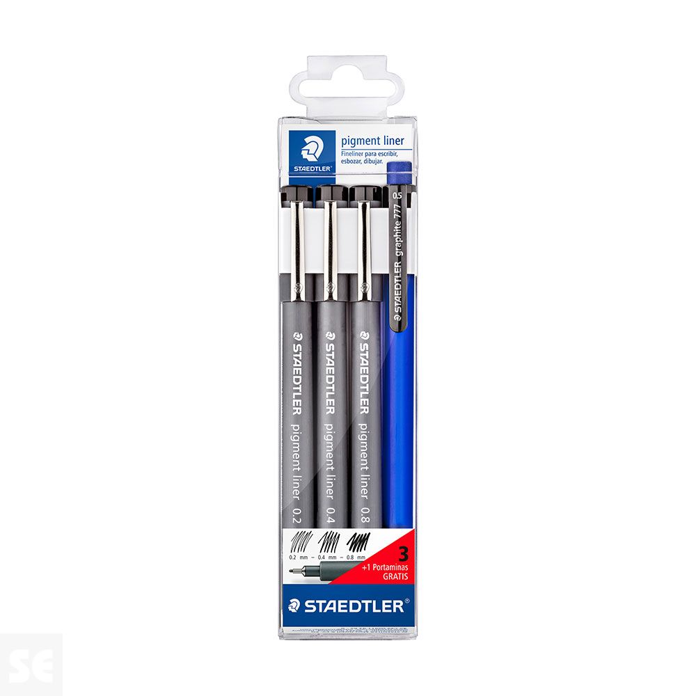 Rotulador calibrado para escribir, esbozar y dibujar con punta engarzada en metal, ideal para usar con reglas y plantillas, tinta pigmentada indeleble de secado rápido, resistente al agua y a la luz, clip metálico, cuerpo de polipropileno (PP), escritura en color negro. Estuche de plástico con 3 rotuladores (0,2; 0,4; 0,8 mm). + REGALO portaminas graphite 777.