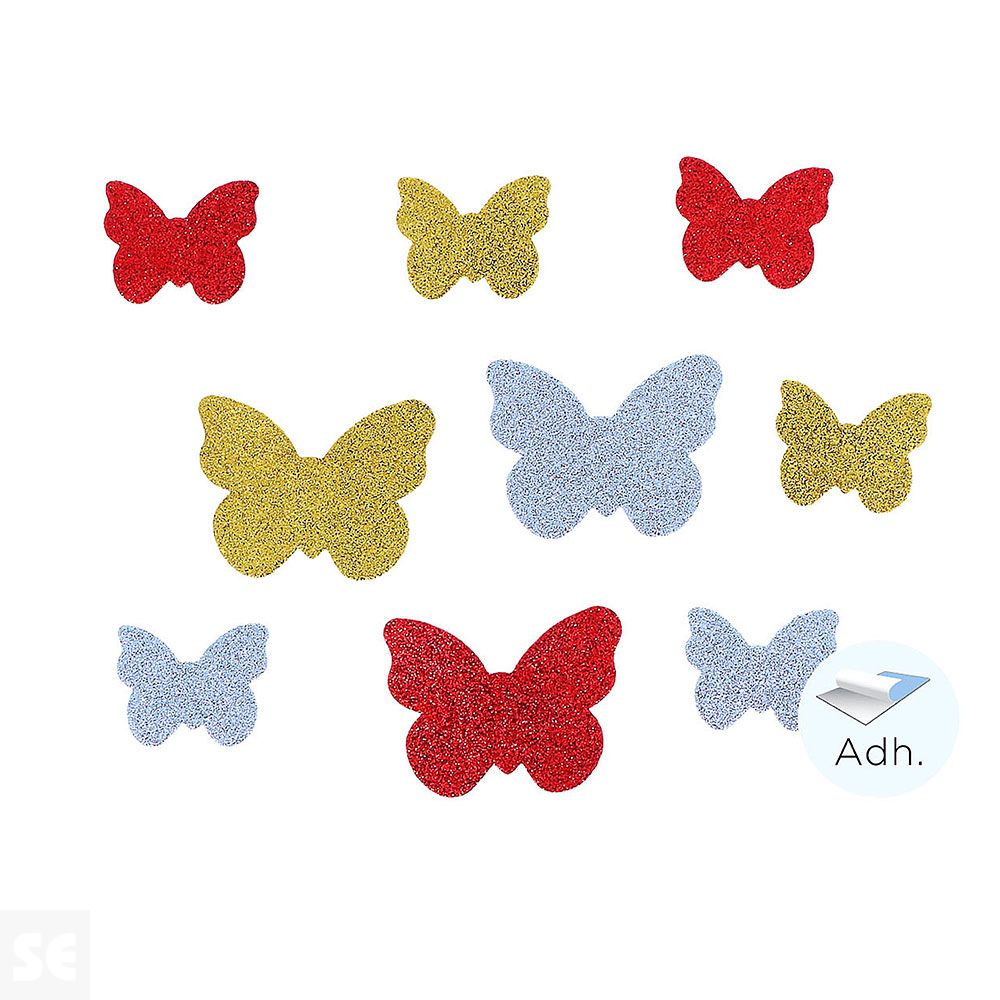 Mariposas de goma Eva adhesiva con purpurina en 3 colores distintos. Ideales para potenciar la creatividad de los más pequeños complementando trabajos de manualidades. Incluye dos medidas: 35mm y 55mm