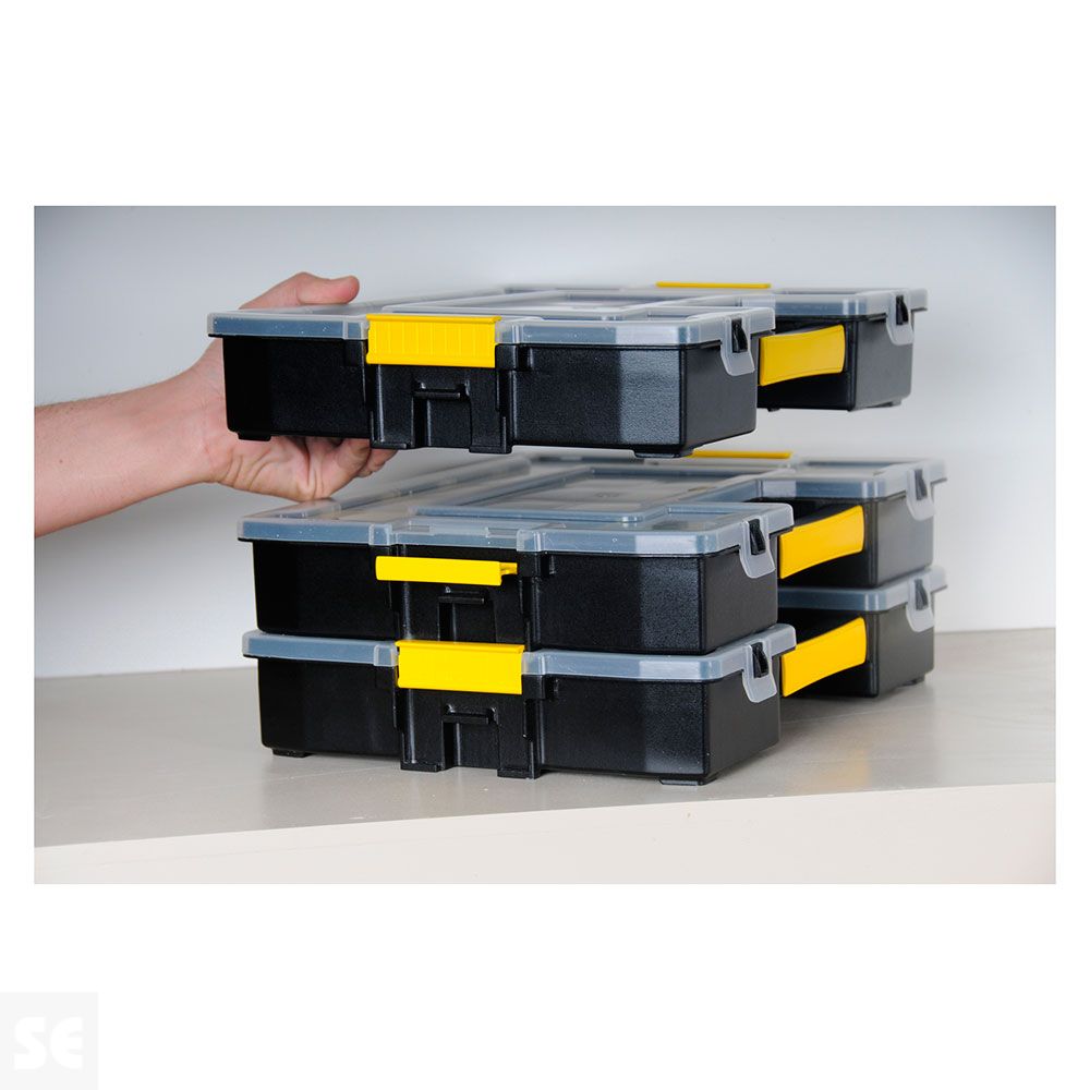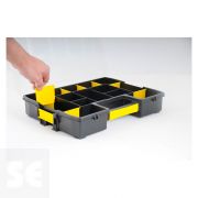 Esquinas ampliables según sus necesidades, diseñadas para poder almacenar herramientas que requieran un espacio modular. Este organizador permite combinar el almacenamiento de herramientas y piezas pequeñas. Compartimentos con separaciones modulables. El diseño interior de la tapa previene el desplazamiento involuntario de las piezas durante el transporte. Posibilidad de transportar hasta 3 unidades a la vez.