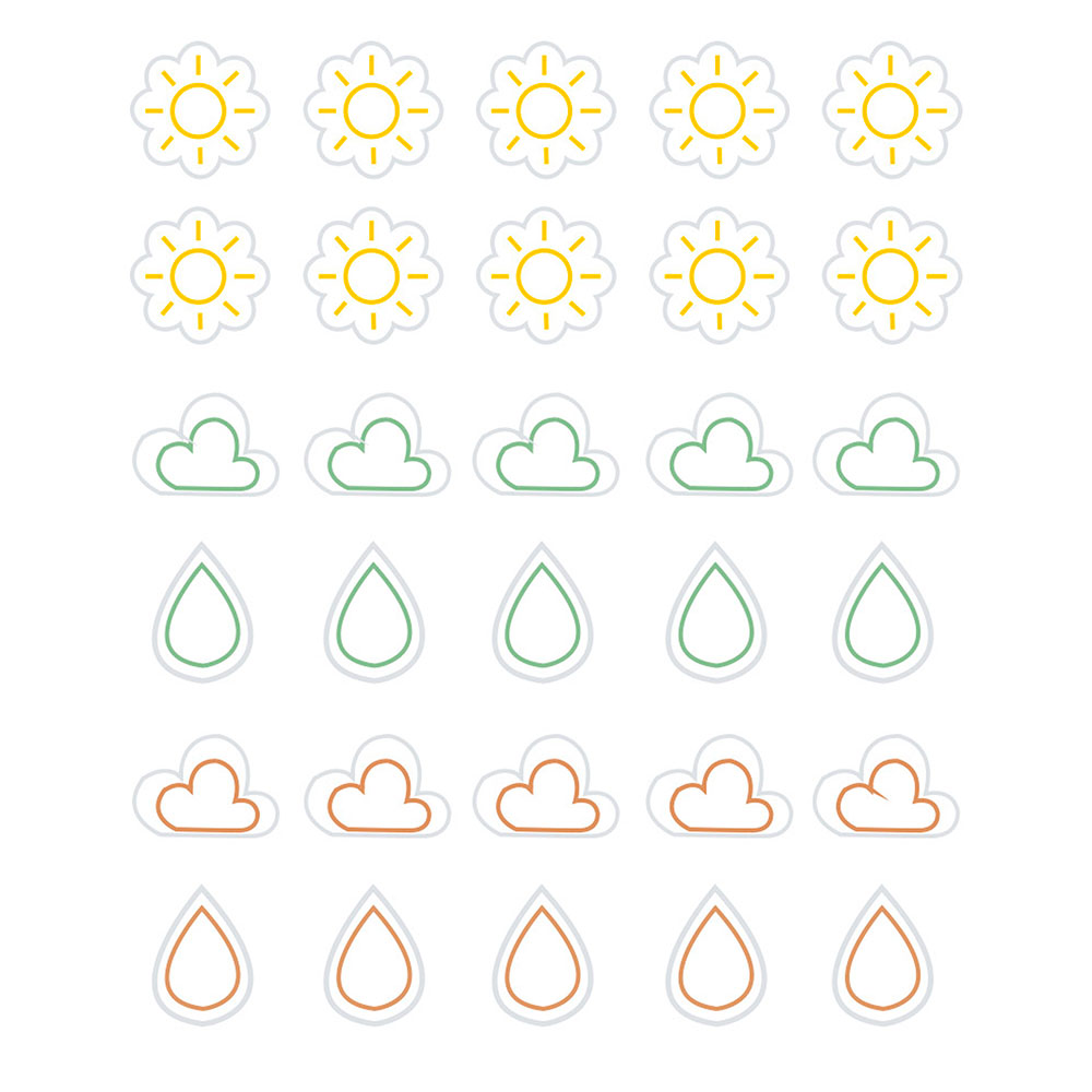 Cada hoja contiene 30 pegatinas pre cortadas de tres colores distintos (10 pegatinas de cada color). Para pegar en diferentes superficies planas como papel, madera, cartón, metal, textil, etc. Aplicación sencilla, fácil y limpia.