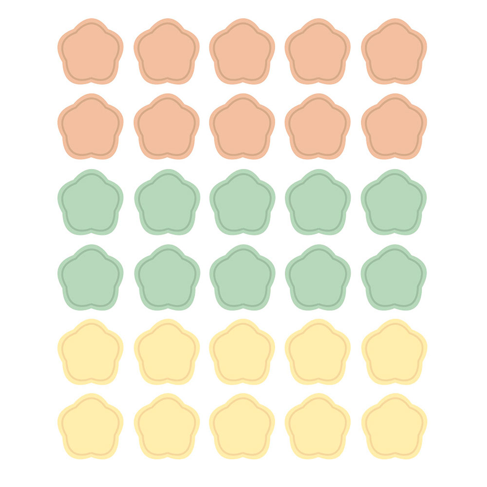 Cada hoja contiene 30 pegatinas pre cortadas de tres colores distintos (10 pegatinas de cada color). Para pegar en diferentes superficies planas como papel, madera, cartón, metal, textil, etc. Aplicación sencilla, fácil y limpia.