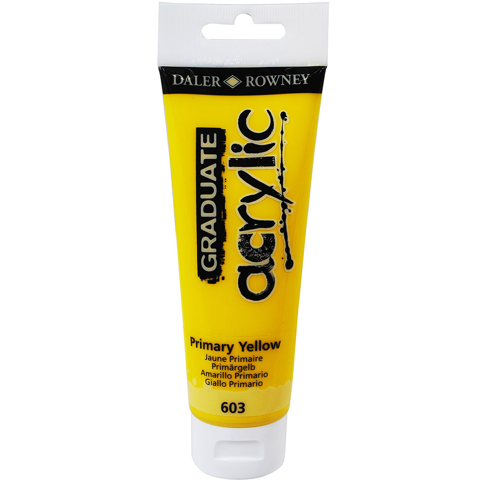 Colores flexibles que no se agrietan.Pintura Acrílica Graduate Amarillo Primario 120ml -- Daler-Rowney Graduate Acrylic es una gama asequible de colores al agua, ideal para estudiantes y aficionados que buscan fiabilidad y rendimiento.