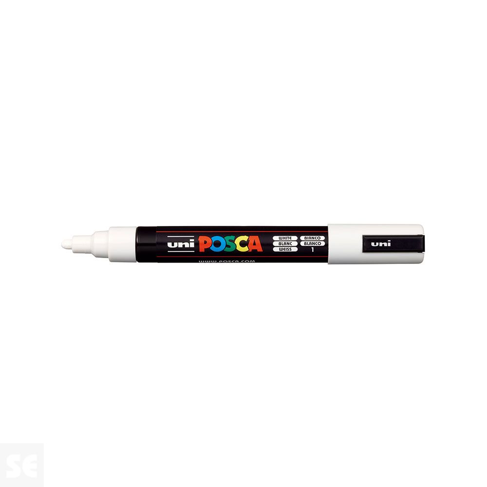 Rotulador Pintura Posca Blanco Pc5m 1,8-2,5 mm. Cuerpo de plástico (PP). Marcador de pintura con tinta pigmentada base al agua. Pinta sobre cualquier superficie y es muy resistente a la luz. Es inodoro. Las manchas se pueden lavar con agua, desapareciendo inmediatamente. Ideal para cartelería, decoración, escaparatismo, posters, etc. Permanente sobre superficies porosas. NO ES TÓXICO.