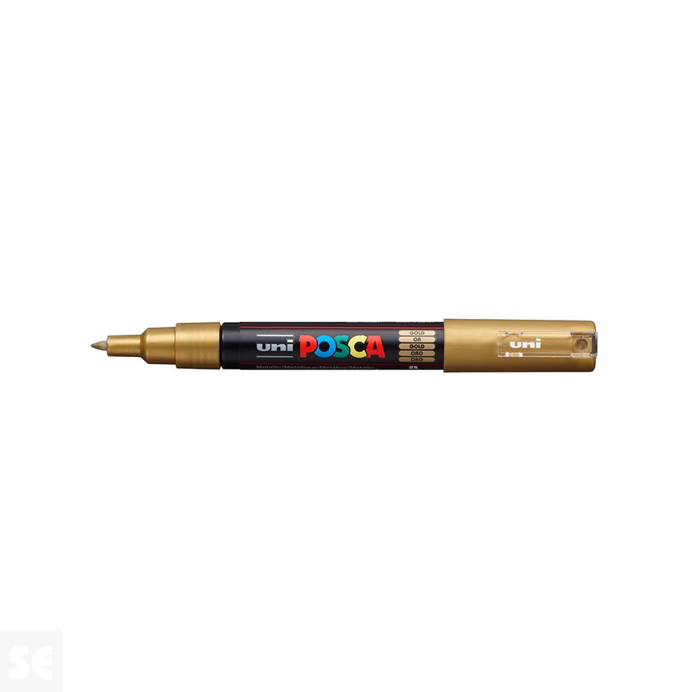 Rotulador Pintura Posca Oro Pc1m 0,7 mm. Cuerpo de plástico (PP). Marcador de pintura con tinta pigmentada base al agua. Pinta sobre cualquier superficie y es muy resistente a la luz. Es inodoro. Las manchas se pueden lavar con agua, desapareciendo inmediatamente. Ideal para cartelería, decoración, escaparatismo, posters, etc. Permanente sobre superficies porosas. NO ES TÓXICO.