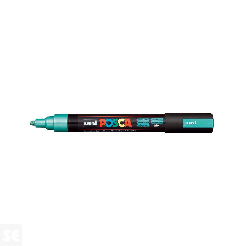 Rotulador Pintura Posca Verde Metálico Pc5m 1,8-2,5 mm. Cuerpo de plástico (PP). Marcador de pintura con tinta pigmentada base al agua. Pinta sobre cualquier superficie y es muy resistente a la luz. Es inodoro. Las manchas se pueden lavar con agua, desapareciendo inmediatamente. Ideal para cartelería, decoración, escaparatismo, posters, etc. Permanente sobre superficies porosas. NO ES TÓXICO.