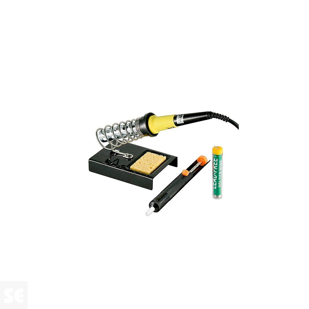 Contenido: soldador, soporte de soldador, bomba desoldadora con punta absorbente.