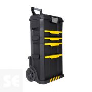 Sistema modular. Cajonera con 2 cajones, uno de poca profundidad para accesorios pequeños y otro con más profundidad para accesorios mayores y guias de rodamiento de bolas. Contenedor con tapa abatible de gran capacidad para herramienta electrica, niveles etc… Mango telescópico en aluminio. Bolsillos traseros para herramientas largas, como niveles y serruchos.